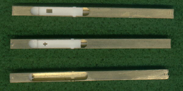 Three different kinds of jack bodies. The upper two are equipped with Burton tongues. The top one has a square opening for a leather plectrum. The center one has a cruciform opening for a delrin plectrum. The bottom one shows how the brass is machined to accept the tongue.