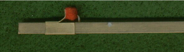 The 4' stop may be played from either the upper or lower manual. It can be brought into play by the pedals without jamming up the works. This is accomplished by the use of a special “dog leg” jack, shown above. The brass body of this jack is 6 1/4" long. These jacks have leather dampers which are glued to the side of the jack. This is omitted on the jack pictured above.